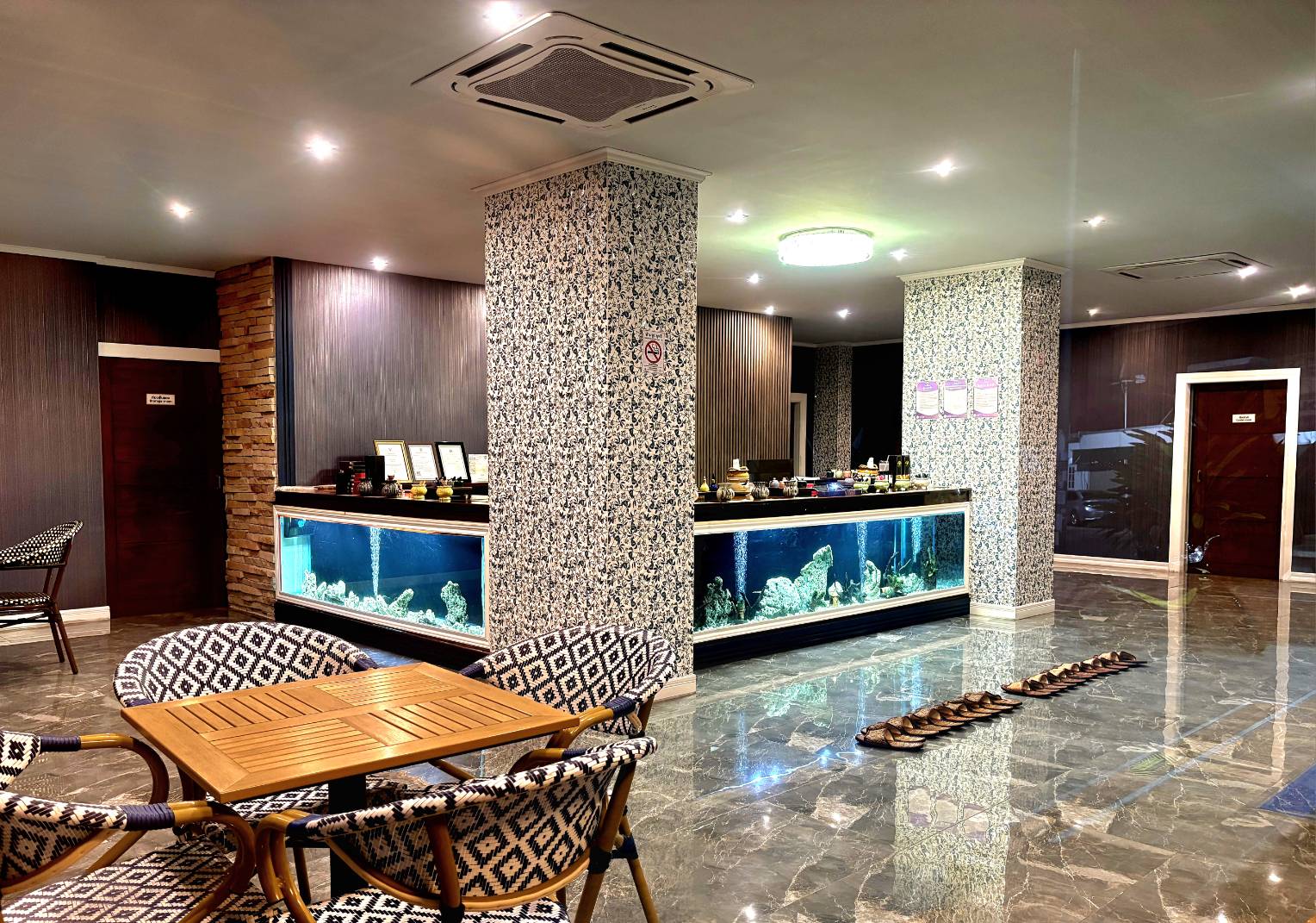 Relax in a beautifully decorated shop with a unique fish tank feature
